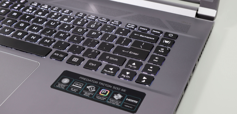 Bàn phím Laptop Acer Gaming Predator Triton 500 SE PT516-51s-71RW NH.QAKSV.001 về bố cục không thay đổi và hầu hết đều ổn, với các keycaps và phím điều hướng có kích thước Fullsize. Về trải nghiệm, phản hồi là nhấp chuột tốt, hành trình phím vừa phải, tạo cảm giác gõ phím nhẹ nhàng, êm ái và keycaps khá lớn, mang lại cảm giác thoải mái khi sử dụng khi gõ và chơi game